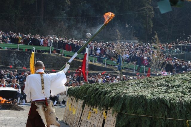 燃えさかる炎の回りを梵天札の差さった御輿が歩きます。