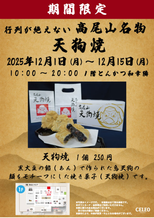 高尾山名物でおなじみの「天狗焼」がセレオ八王子に初出店します! 天狗焼は、外は「カリッ」中は「もちもち」とした生地は香ばしく、北海道産の大粒の黒豆あんが入っているのが特徴です。 本来は山上の高尾山スミカでしか販売しておらず、山に登らないと手に入らない天狗焼… この機会に是非、焼き立てをご賞味ください。 期間 2025年12月1日(月)〜12月15日(月) 時間 10:00〜20:00 場所 セレオ八王子北館1F とんかつ和幸隣